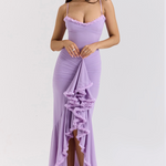 Přiléhavý střih jemně obemkne tělo a podtrhne křivky, zatímco detaily s volánky na dekoltu a na sukni přinášejí vzdušný, romantický vzhled. Přední otevření s jemným romantickým detailem dodává šatům další úroveň půvabu. Dlouhá linie šatů vytváří sofistikovaný, stylový dojem pro elegantní prezentaci.