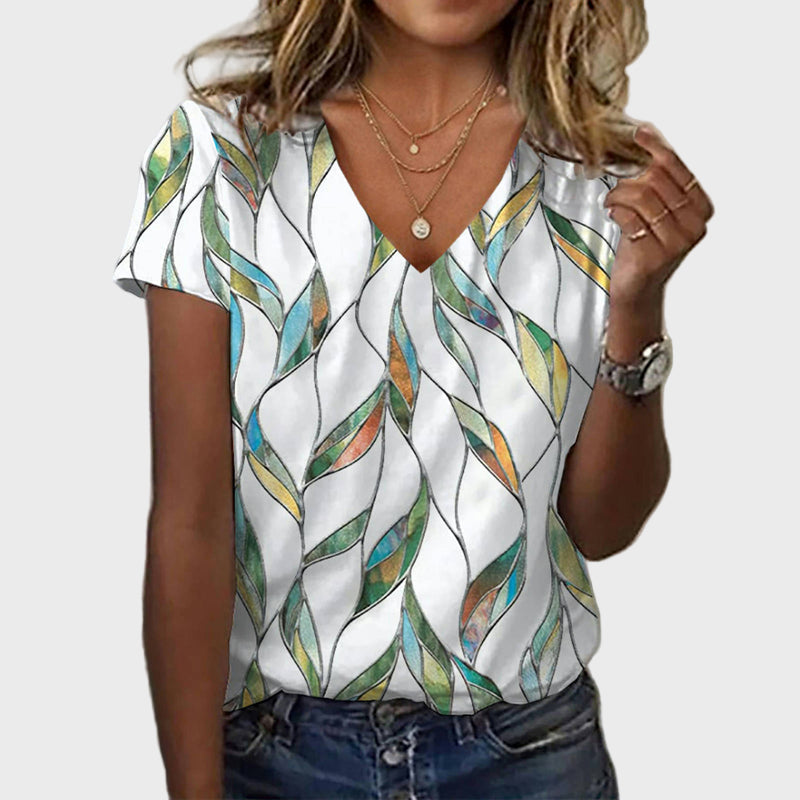 Ohromující jednoduchost inspirovaná moderním trendem. Tato blůza v bílé základně zdobí pestré, vlnité motivy v odstínech zelené, modré a zlaté, které oživí každý outfit. Výstřih do V dodává jemnou ženskost a volný střih pohodlí i eleganci pro každou příležitost.