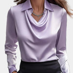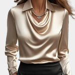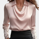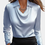Saténová textilie přináší jemný dotek a luxusní vzhled na dotek i na pohled. Klasický límec dodává vzhled profesionální a čisté linie, zatímco drapovaný dekolt dodává ženskost a nadčasový půvab. Přirozeně padnoucí střih zjemňuje siluetu a zajišťuje pohodlí po celý den.