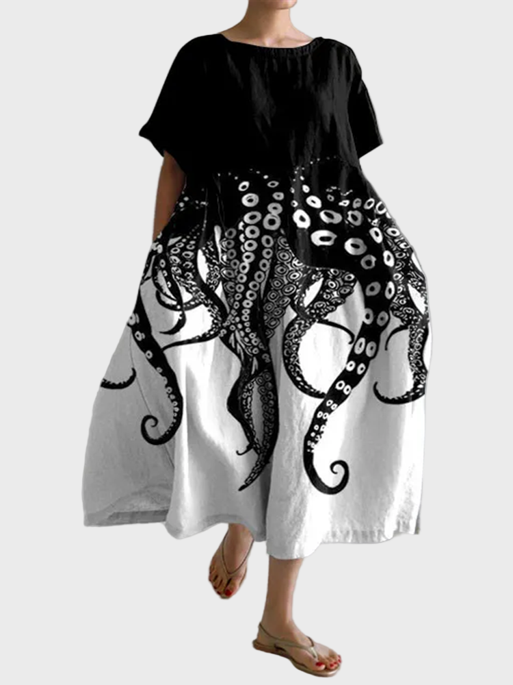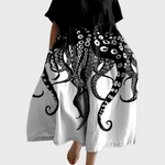 Unikátní černobílý kontrast a působivý motiv chobotnice dodávají šatům charakter, který se hodí pro letní dny se stylem.