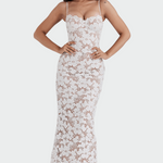 Elegantní bílé krajkové maxi šaty spojují jemný florální vzor s nadčasovou elegancí. Průsvitná krajka dodává šatům nádech luxusu a romantiky, zatímco lehký materiál vyzařuje ženskost a sebejistotu. Díky tenkým ramínkům a přiléhavému střihu šaty tvarují linii postavy krásně a sofistikovaný vzhled vhodný pro slavnostní okamžiky.
