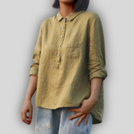 Elegantní lněná halenka v sytě zelené barvě spojuje nenápadnou eleganci s každodenním pohodlím — ideální volba pro ženy, které hledají jednoduchost s plnou funkčností.