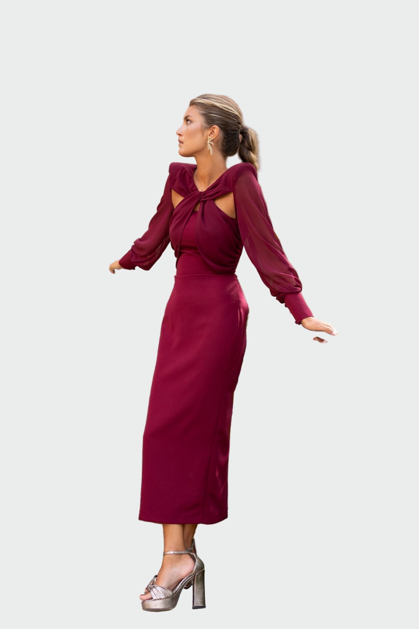 Elegantní midi šaty v bohaté burgundské barvě jsou synonymem pro špičkovou eleganci a sebevědomí. Tento model požadoval ženskou siluetu díky přiléhavému střihu, diskrétně řešené průry na dekoltu a průsvitné rukávy dodávají nádech luxusu a odvahy.