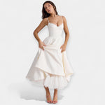 Přitažlivá tylová sukně v délce midi dodává šatům romantický nádech a lehký pohyb, zatímco přiléhavý živůtek vyžaduje pas a tvaruje postavu.