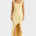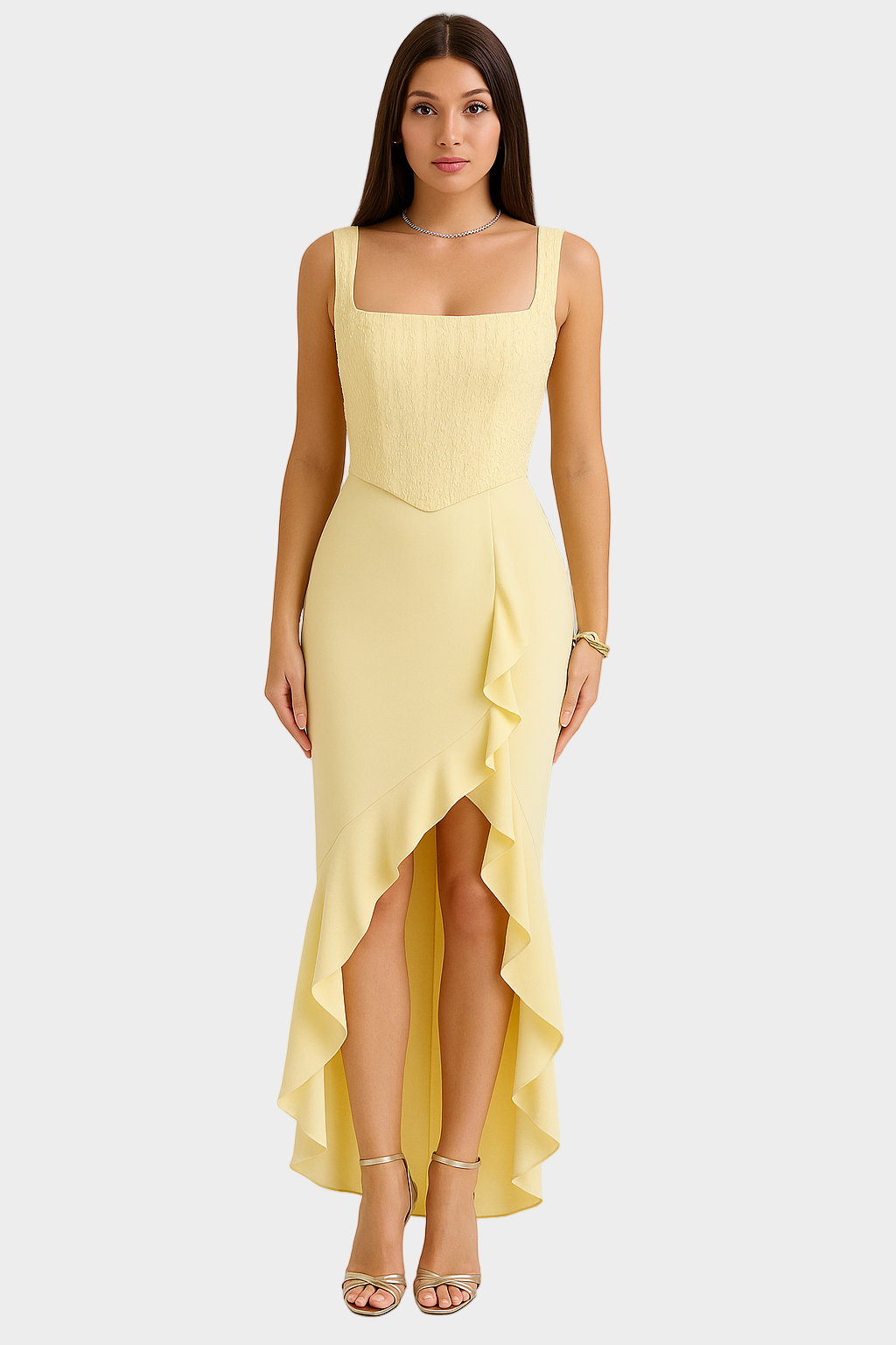 Rozzařte svůj vzhled saténovým korzetovým šatem s volány – kousek plný lesku, ženskosti a moderního stylu. V jasně žluté barvě upoutá na první pohled a dodá vašemu outfitu svět pro letní dny.