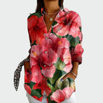 Stylová halenka s květinovým vzorem je ideální letní kouskem pro jarní a dny. Dlouhý rukáv a výrazný květinový motiv v odstínech červené a růžové dodávají outfitu živost a svěží náladu. Klasický límec a zapínání na knoflíky ji činí univerzálním kouskem, který se hodí jak pro casual look, tak pro elegantní příležitosti.