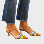 Objevte dámské lodičky s nízkým podpatkem, které spojují pohodlí a hravý styl. Tyto boty v sobě snoubí živé barevné tóny – modrá, žlutá a hnědá – a dodávají každé kombinaci odvážný charakter. Elegantní tenký pás na kotník s kovovou sponou zajišťuje jisté držení a diskrétní, přitom sofistikovaný vzhled pro každý okamžik.