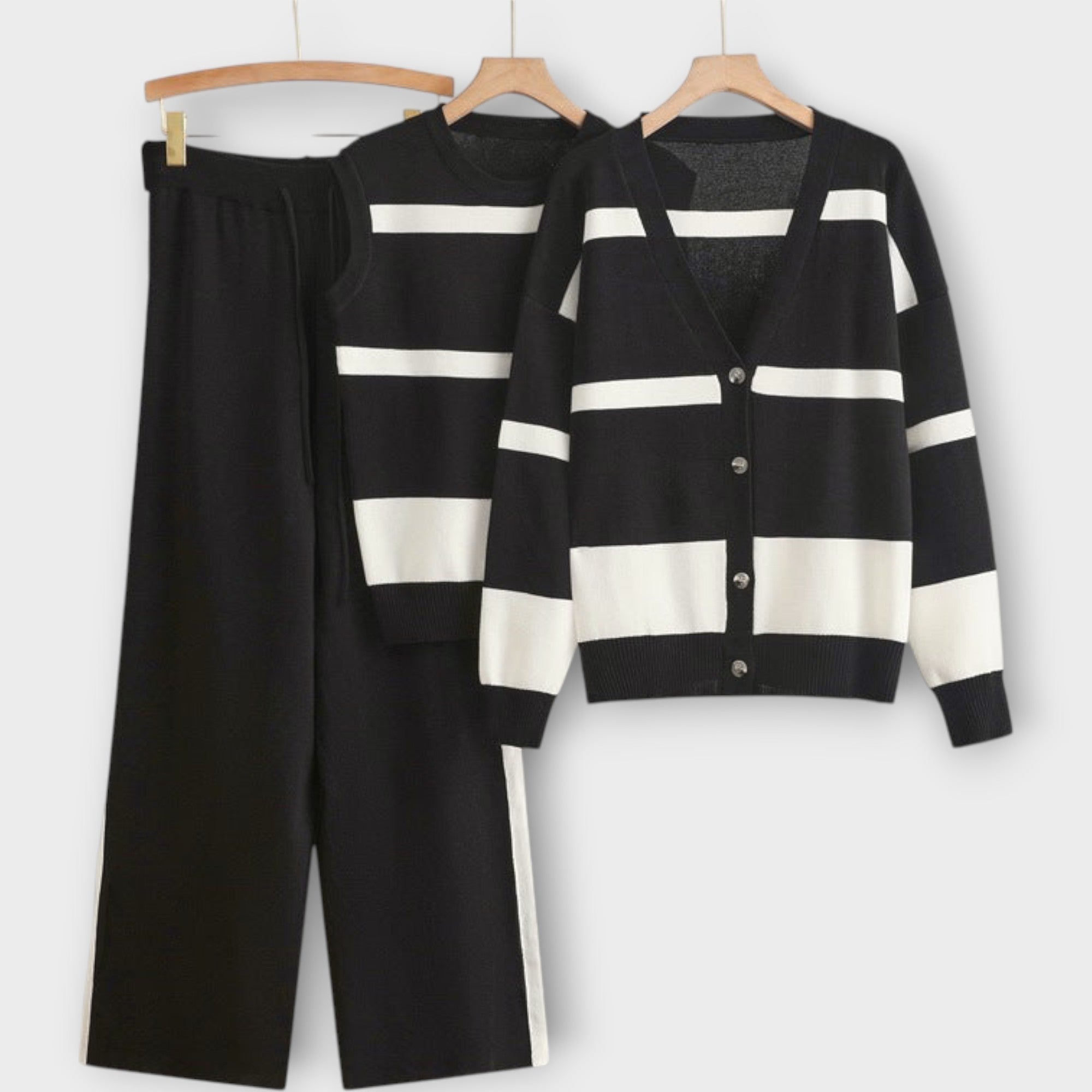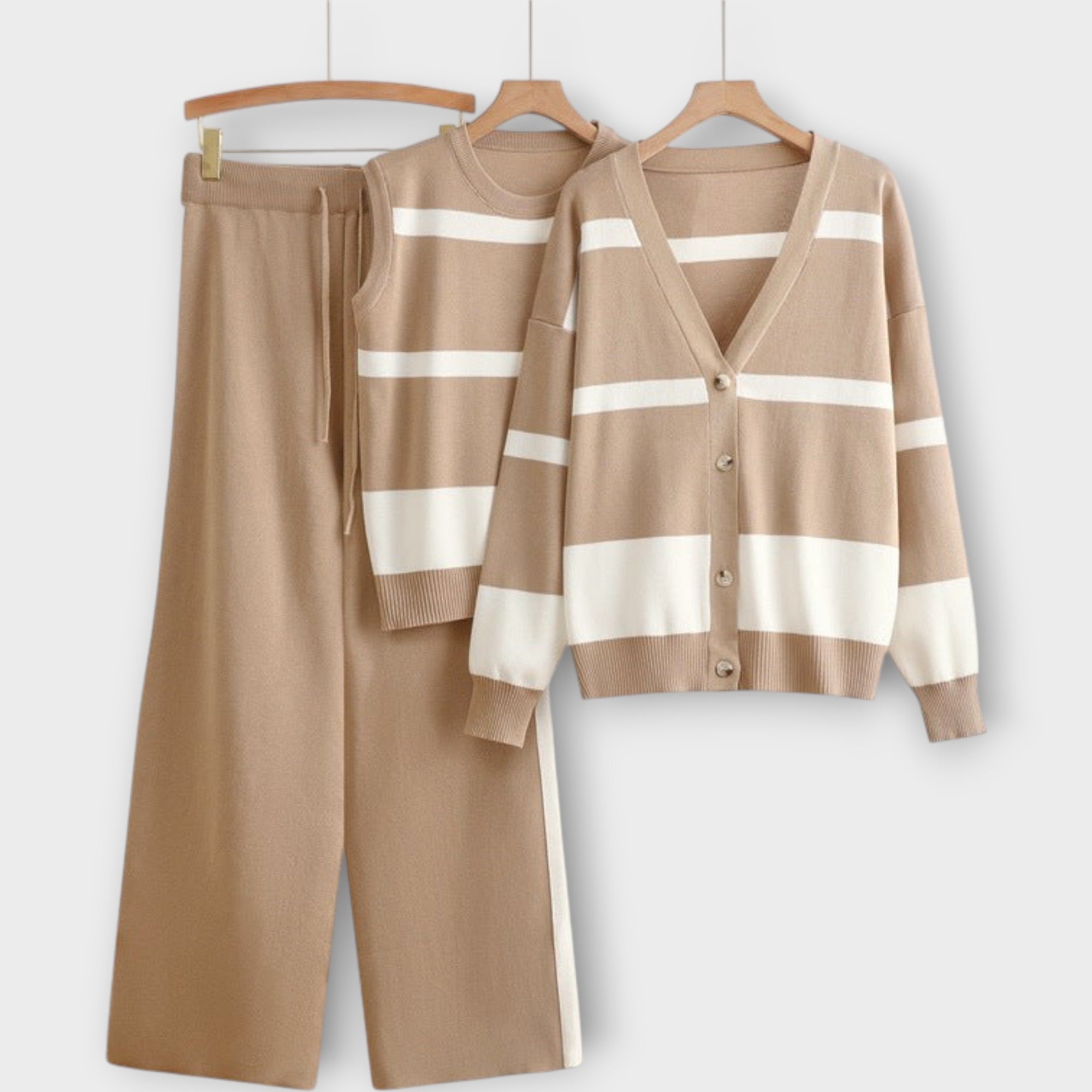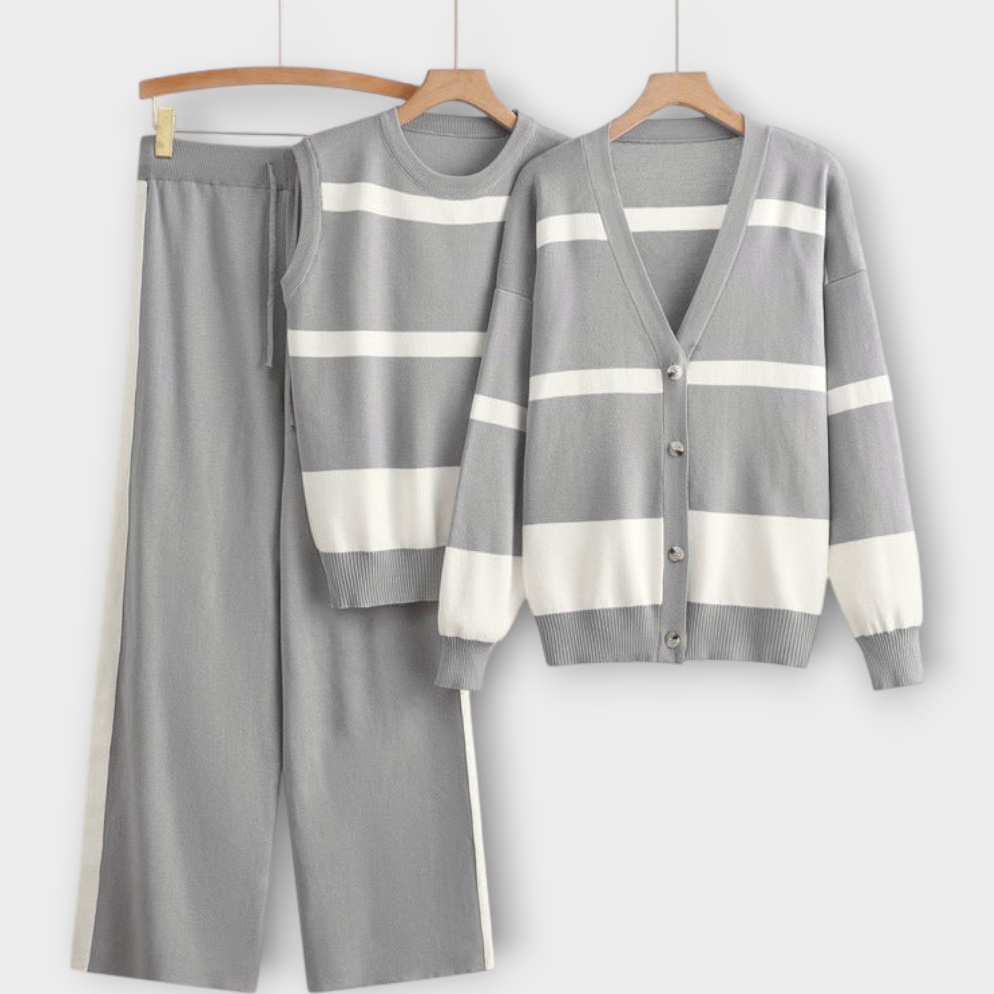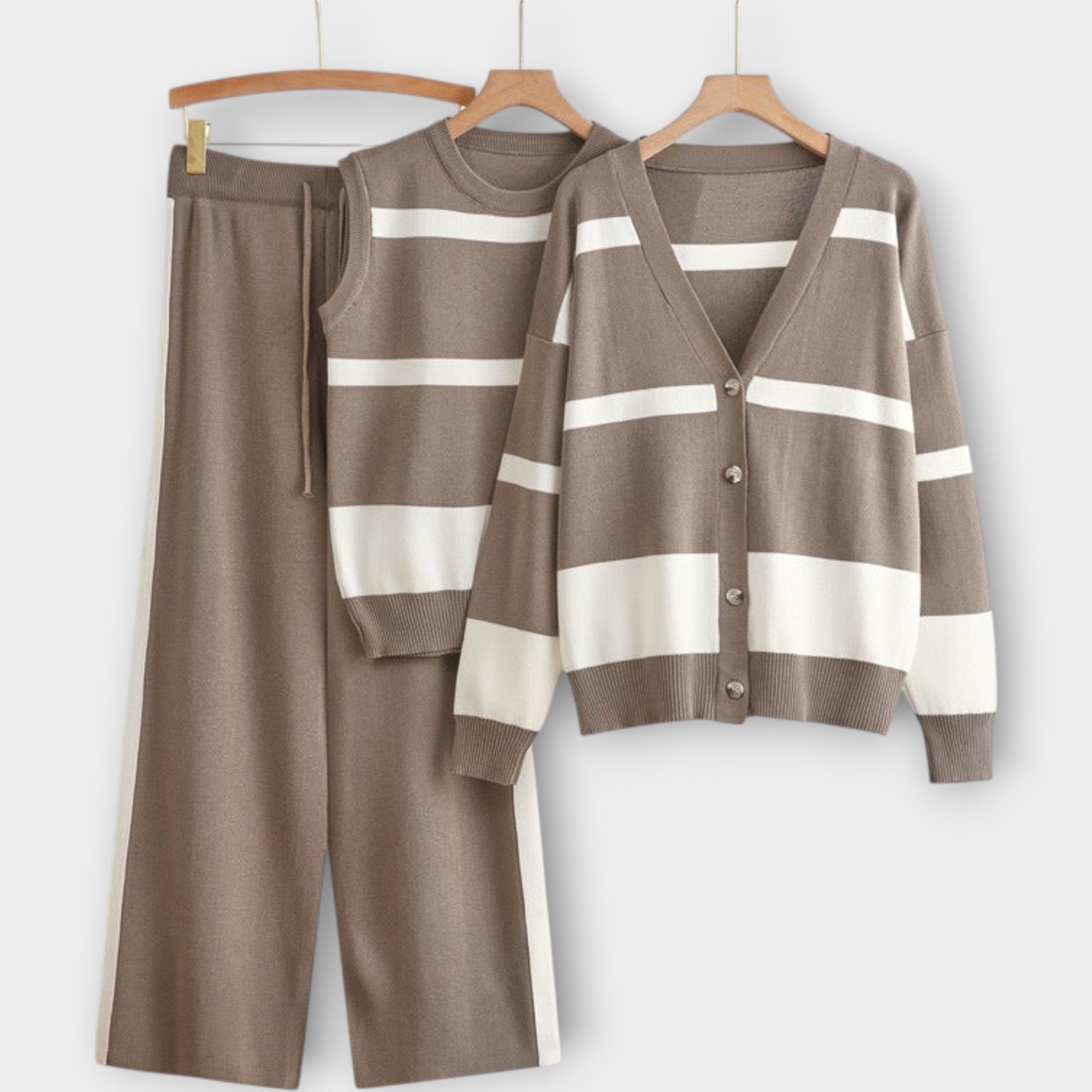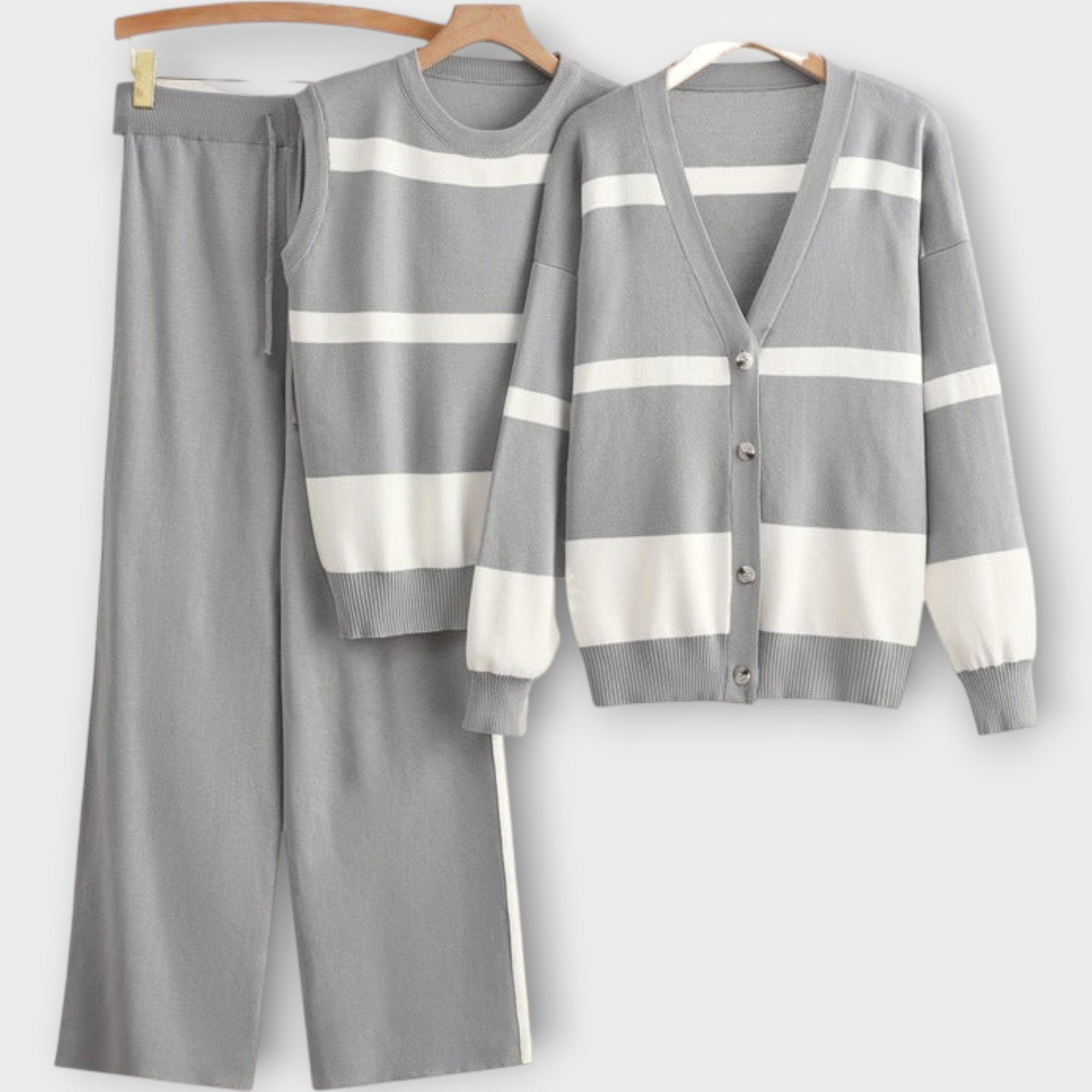 Hledejte dokonalou mezi praktičností a elegancí. Tento pletený set s kardiganem, vrškem a kalhotami je tu pro vás, aby váš šatník získal novou dimenzi pohodlí a stylu.