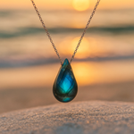 Náhrdelník Lacrima del Mare zachycuje duši moře. Přírodní labradorit, s třpytivými odrazy modré a hluboké zelené, připomíná vlny osvětlené měsíčním světlem a ztělesňuje poezii vody. Dokonalý dárek, který symbolizuje introspekci, svobodu a krásu přírody.