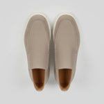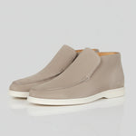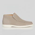 Tyto pánské semišové loafers boty v greige kombinují neutrální odstíny v designu slip-on chukka. S semišovým svrškem, kulatou špičkou a plochým podpatkem jsou univerzální jak pro ležérní, tak pro smart-casual outfity.